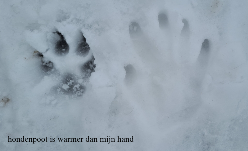 *Sneeuw en ijs, laat je hond niet teveel sneeuw eten, een keer een sneeuwbal naar hem gooien die hij dan opvangt is niet erg maar niet aan de gang blijven. De kou hiervan is niet goed voor maag en darm, diarree, braken, enz. Als de sneeuw ondanks het insmeren van de voetjes toch klontert tussen de tenen en voetzooltjes trek deze er dan niet uit maar smelt ze in je handen of als je thuis bent zet het voetje in een bakje met lauw water. Bij langharige honden kan je het vele haar rondom de voetjes wegknippen (niet tussen de tenen) zodat er ook al minder in blijft hangen.