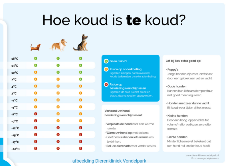 Warm hebben en houden, laat je hond ook wennen aan de kou. In de herfst al beginnen met wat langere wandelingen, dan stimuleer je de vachtgroei. In de winter dan weer de kortere wandelingen. Oudere honden, puppy’s en honden met een hele korte vacht kun je ook een jasje aandoen. Let ook op de voeding van je hond, ze mogen in deze periode net meer of wat ‘vetter’ calorierijk te eten krijgen, mits je hond ook lekker vaak mee naar buiten gaat. Als ondanks alle voorzorgmaatregelen je hond toch teveel afkoelt hoe zie je dit dan? * Overmatig rillen, * het ademen gaat moeizamer, * de hartslag wordt trager, * de wil om te spelen is er niet meer. Verzorg je hond op zo’n moment, geef hem wat hondensnoepjes daar zitten vaak wat meer vetten en suikers in, breng hem naar een warme omgeving en geef lauwwarm drinken.